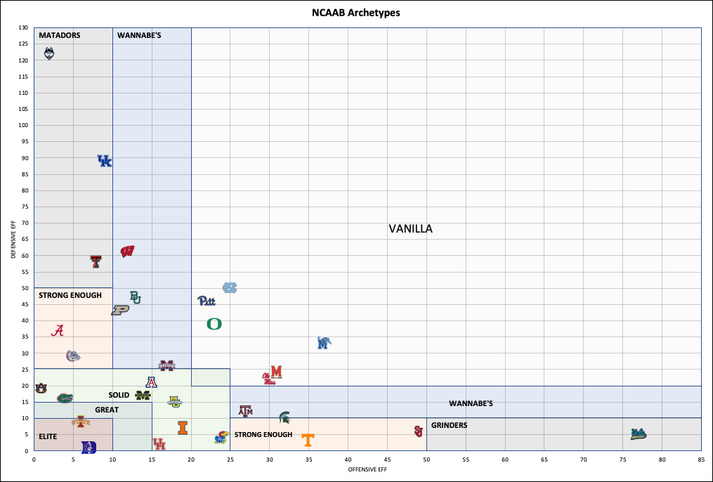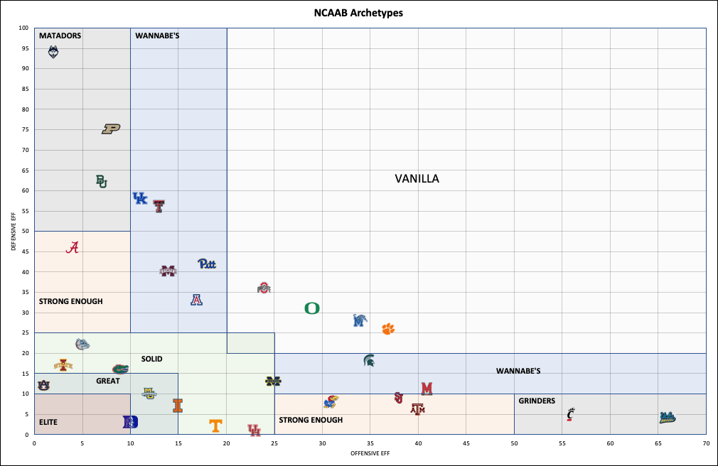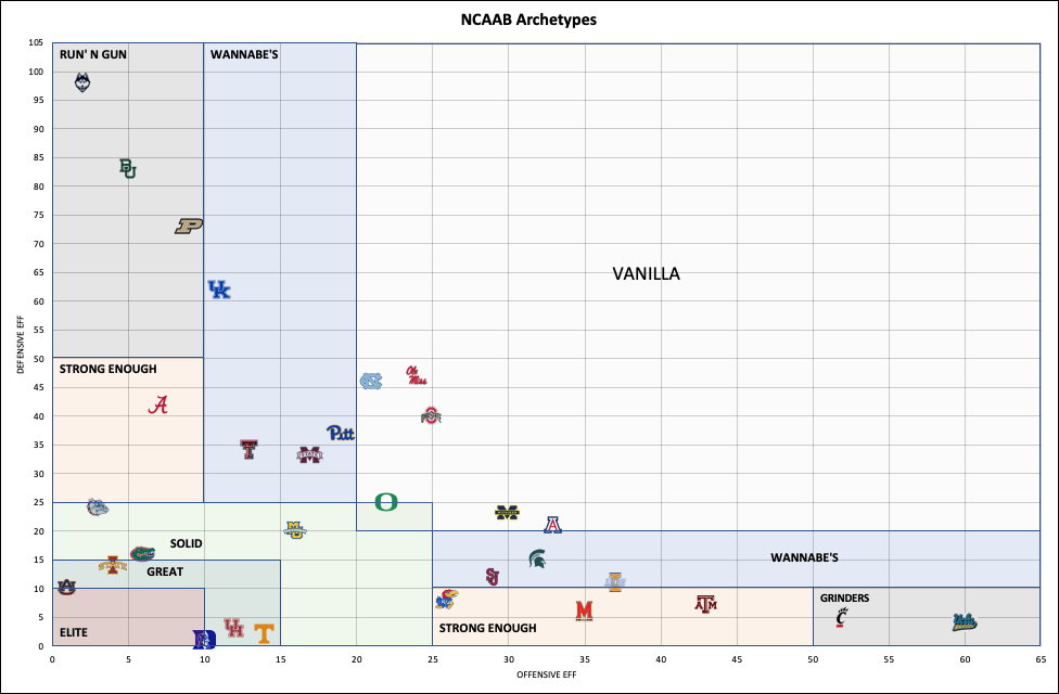 This is where we start getting a little unique and into the weeds, as we’ve had to find a bucket for those that fail to land in the top-25 on both ends but are elite on one end of the floor. Conversely they aren’t horrible on the other end, so they don’t drop down to our vulnerable categories. They’re just good enough on their weaker end of the floor that their elite abilities are able to carry them with some confidence out of the first weekend. I had to find the line of demarcation, where the weakness became tangible in the results. The teams ranking above 50 over and over again stood out with early exits, so that’s where it stuck after the numbers confirmed that the teams that live in this area perform much better than those in the “Run N’ Gun” or “Grinders” categories just by limiting that weakness. Obviously, the weakness is still indicating less reliability though, with nearly half as many “Strong Enough” teams reaching the Elite 8 as “Elite” teams (35% vs 67%.)