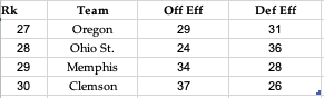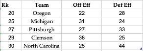 UNC and Ole Miss are back as they re-enter following the fall of teams like Cincy and Clemson. They are not exceptionally strong on either end, that’s why they’re here, so if they do hang around the top-30 it might continue to be in Vanilla land. Oregon bounced back from their beating by Illinois but still haven’t separated themselves, and Pitt and Memphis look like they belong right here or not even in the top-30. Also Maryland is in a free fall, we’ll see if they bounce back.