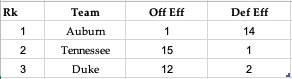 Auburn right now is the darling of every efficiency nerd out there, gasping at the absurd offensive efficiency numbers they have put up through 15 games. And it is historic, worthy of a gasp even. However, based on what I have setup here with the archetypes, Auburn doesn’t land in the top tier, with a 19th ranked defense they are left in what I would call the 2nd tier right now with teams like Florida and Houston. Many would find that absurd, maybe just write off the entire exercise based on that one fact. However wild it may seem, I am just looking at the data, and what history can tell us. Above all, if you’re just looking for me to tell you the highest rated teams are the best teams then you’re in the wrong place. I’m trying to separate teams, to understand why the best don’t always win it all. Right now what it suggests is that Auburn’s holes defensively are an indicator, one that puts pressure on their offense to be elite every night, which they have done well with so far I might add. Even the one loss to Duke they scored 78 points on 63 possessions which is highly efficient, but it wasn’t enough as they gave up 84 to the Blue Devils. Therein-lies the concern, could they be hampered in an Elite 8 game by their defensive issues, facing another top flight offense that could find a way to slow them down just enough. Iowa St nearly did it, leading by 16 at halftime only to fall by 2 while scoring 81 on 71 possessions. Even Houston pushed them to the brink putting up 1.11 ppp in a 5 point loss that they led with 10 minutes to go. So in their 3 games against other top teams they went 2-1 with all games decided by 6 points or less. What that suggests to me is the gap isn’t as wide as people think, because they are struggling to get stops consistently. I’m not suggesting Auburn is bad, or that they’re a first weekend upset pick, not in the slightest. But in a year where there are several elite teams establishing themselves, Duke/Iowa St, who show elite ability on both ends of the floor, you should at least think twice about crowning Auburn the obvious best team. As the data shows, we have seen time and time again elite offensive teams lose because they couldn’t get stops, and while Auburn is still a top-20 defensive team, they’ve fallen from top-10, so a worrisome trend. It’s also something that could get remedied over the coming weeks but I had to touch on it as the prevailing thought is they’re the obvious #1, but you’ll see below that’s not the thought here at this moment in time.