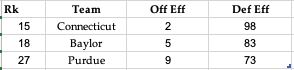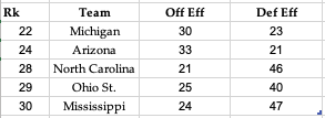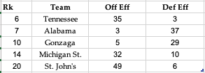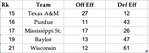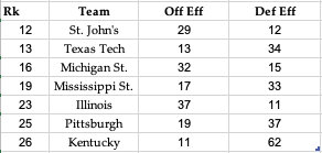 We have a bunch of teams right here knocking on the door of great but just not quite there. Florida’s defensive numbers are being bogged down by 2 games against UK and UNC in which they gave up 84 and 106 respectively. I see them moving up soon, and Auburn is fading defensively but could easily snap back up a peg. I’m not sure Houston is good enough offensively to crack the top-15 but they have bounced around quite a bit so we’ll see how it goes. The others aren’t as strong but newcomers Michigan and Arizona are getting hot as we roll through January.