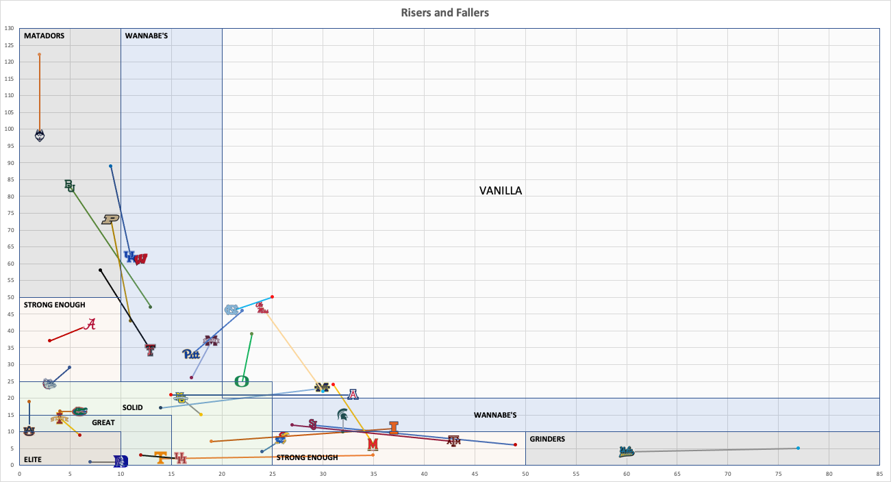 Memphis and Clemson are our new entrants as UNC and Ole Miss fell out this week. They are not exceptionally strong on either end, that’s why they’re here, so if they do hang around the top-30 it might continue to be in Vanilla land. Oregon took a beating at the hands of Illinois so we’ll see how they rebound from that this next week as they’re falling quickly toward sub-30 territory after being “Solid” at one time.