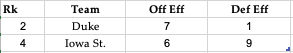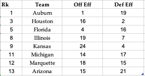 Here is where we find the cream of the crop in college basketball, as these are the teams who are top-10 in both offensive and defensive efficiency. These are exceptionally good teams, with only 1 such team over the last 2 seasons. However, we’ve already had Iowa St land here and Auburn and Duke are sliding in this week, so it’s not looking like a year without an elite team. Over 2/3’s of teams who enter the tourney as top-10 on both ends teams have made it to the Elite 8 which is an astounding number given just a slight dip to top-15 drops to 55%.