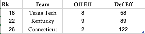 Finally a bit of a change here as Purdue and Baylor busted out and UK and Texas Tech found their way in. UConn is fading defensively but hanging around the top-30 thanks to Hurley’s offensive genius. Either way, can’t trust these teams.