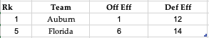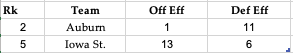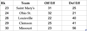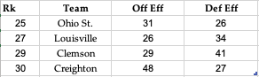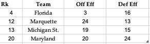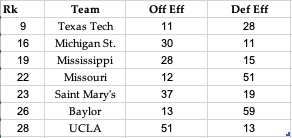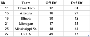Auburn remains just a step off when it comes to defense, despite being most people’s favorite and the AP #1 they sit 3rd on our list. Still a very safe bet to get beyond the first weekend and probably an even deeper run, it just gets a bit alarming when they struggle to get stops at times. Iowa St fell off of a cliff but Florida jumped up to replace them, despite a loss to Tennessee they beat Vandy handily and have improved enough defensively to join Auburn here.