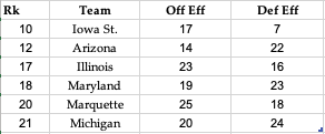 Houston and Duke remain the stalwarts in the Elite group, as they continue to play extremely efficient on both ends of the floor. Interestingly, Houston is not in line to be a 1 seed at the moment, so they could be a darkhorse entering the tourney, while also having a potentially tougher path than Duke.