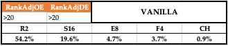 Below I will provide some context for each archetype and list the teams that fall in at the time of publishing. There will be a graphic for each category that shows the criteria and the percentage of teams who fell into that category since 2005 that made it to each round. For example, 83.9% of Elite teams have made it out of the first weekend into the Sweet 16. Juxtapose that with just 19.6% of Vanilla teams and you should catch on real quick to what we’re doing here.