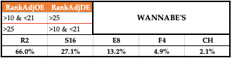 This is where we start getting a little unique and into the weeds, as we’ve had to find a bucket for those that fail to land in the top-25 on both ends but are elite on one end of the floor. Conversely they aren’t horrible on the other end, so they don’t drop down to our vulnerable categories. They’re just good enough on their weaker end of the floor that their elite abilities are able to carry them with some confidence out of the first weekend. I had to find the line of demarcation, where the weakness became tangible in the results. The teams ranking above 50 over and over again stood out with early exits, so that’s where it stuck after the numbers confirmed that the teams that live in this area perform much better than those in the “Matadors” or “Grinders” categories just by limiting that weakness. Obviously, the weakness is still indicating less reliability, with nearly half as many “Strong Enough” teams reaching the Elite 8 as “Elite” teams (35% vs 67%.).
