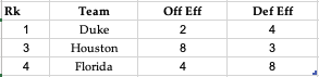 We’re back for another update as we continue to track the top teams across college basketball and separate the wheat from the chaff. It’s pretty evident by the data as well as just watching the games that we have 4 teams that have separated themselves at this point. Duke, Florida, Houston and Auburn very clearly standout, and the domination at the top of the sport is something we haven’t seen in some time. You have to go all the way back to the 2015 season, in my opinion, to see this level of top heavy play in college basketball. That year we had undefeated Kentucky (“Elite”) that lost in the Final 4 to Wisconsin, who was very similar to Auburn as the #1 offense in the country and flirting around top-15 defensively. You also had Duke who won it all that year and then Arizona/Villanova (“Great”) as dominant teams with an overall efficiency north of 33. Arizona lost to Wisconsin in the Elite 8 and then Nova bounced out early in round 2 in the big upset that year. That was basically the only thing that didn’t go according to plan, with 3 of the 5 dominant teams getting to the Final 4. I am starting to expect a similar type of tourney, with now those 4 elite teams rating higher than everyone last year but UConn. Every year people say there’s more and more parity, the tourney is less and less predictable, and maybe beyond those top 4 it will be this year, but it’s just a fact we haven’t seen this level of efficiency and domination from a group of teams like we have this year since 2015. Obviously there are a couple of weeks left to play until the dance, but at this point you’d be foolish to pick a national champion that isn’t 1 of those 4 teams. Also, in reference to what I talked about last week, we lost a couple of teams from the trustworthy categories already so it’s already leveling out at 15 teams.