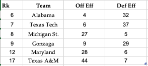 Still have Auburn just a step off the pace but as you can see in the numbers teams here are still very successful in March, especially the first weekend. I will have Auburn in my Final 4, but losing to Florida in a SEC clash.