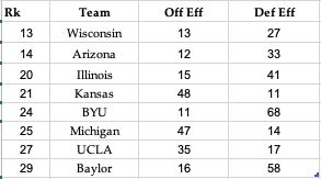 The next couple are going to be pretty obvious but we’re notching down a peg to teams who weren’t top-10 but do happen to be top-15 on both ends of the floor. It’s pretty consistent in terms of odds of getting out of the first weekend, but does drop off decently as you go to Elite 8 and beyond. Still, with only 31 teams to have entered the tourney as “Elite” since 2005 we may find the 2nd or 3rd options this year fall here. These aren’t always your top seeds either, with 2023 UConn being a perfect example as a 4 seed falling here and winning the whole thing.