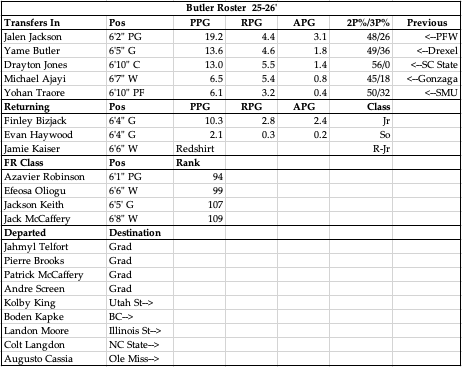 As an Indiana native seeing this Butler program struggling like this is a sad sight, but they really don’t have much to work with in this current era of college sports, so they’ll continue to hope that the wily vet Thad Matta can get some momentum going for this program that hasn’t been dancing since 2018. From the looks of it they were able to take one big swing in the transfer portal getting Jalen Jackson to run the show, and they’re going to need him to shoulder a big load offensively. They have some nice pieces to play around him with Butler and Ajayi coming in, and Bizjack returning as a catch and shoot option. In terms of playmaking though it’s going to all be on Jackson. This is probably Matta’s best FR class so that’s good news, but his track record of holding on to the FR he’s brought in is not great, as evidenced by the 5 guys transferring out this cycle. Much of that could be due to the money available at other schools, and that’s just the issue non-football schools are going to face. Short of a mega rich donor they’re left with only what the Big East can provide sans-football. Unfortunate, but Matta is going to have to coach his tail off to get this group back to the dance.