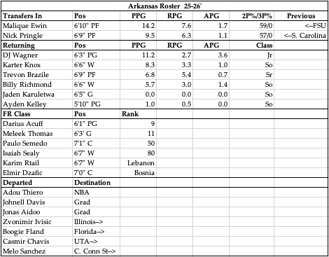 Year 1 under Cal brought Arkansas right back to relevance, and while they weren’t at the top of the SEC he did finally get them rolling as the year went on, seeing them finish 8-5 in the league and get to the Sweet 16 after knocking off Rick Pitino and St. John’s. I think that positive momentum continues into this year, with 4 major contributors back, some international talent and most importantly those two 5-star FR guards who should come in and give them instant pop scoring the ball. They developed into a top-20 team defensively last year, which will need to continue for them to finish where I have them this year. My expectation if that does happen is that the FR guards give them a lift on the other end and all of a sudden you have a team that plays with physicality, the way they did last year, and can score at much higher level. They certainly lost guys like Thiero and Aidoo who helped them on D, but they played stretches without them and the young guys played well. I think we see a jump from Karter Knox and Billy Richmond who both emerged down the stretch and that, combined with the incoming talent, should vault the Razorbacks into contention in the SEC. Cal’s best teams at UK were consistently top-20 defensively, and while it fell off the last few years much of that was due to relying solely on FR that just couldn’t get it down quick enough. The mix of returning experience with some FR adding in where they fit to me is a much more solid approach and should drive them to taking a step forward in year 2.
