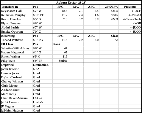 Speaking of question marks, what on earth should we expect from this Auburn program this year now that only Tahaad Pettiford remains? That of course includes former HC Bruce Pearl who just a few days ago as of writing this retired and left the keys to the program to his son Steven. Almost an entirely new roster, a somewhat new coaching staff, at least at the top…what do we do with that? Well, I’m going to try and focus on the talent at hand, and it’s certainly there for this to be a top-25 team despite the turbulence felt in the fall. Pettiford is an All-American caliber guard now that he can run the show and he’ll be joined by Keyshawn Hall who scored at an elite level with UCF last year as a hybrid 3/4 man. Not only that, international big Jovic has promise as well, so there are options here for them offensively. Depth is going to be a concern though there’s no doubt about that, as they’re simply forced to rely on JUCO guys and FR to fill out their rotation. They may not need them to score double figures but the FR Williams-Adams and Magwood along with the DII/JUCO transfers are going to need to provide quality minutes there’s no way around it. So, what I’m saying is they’re top heavy, with at the very least a 1-2 combo in Pettiford and Hall that should ball out every night and get them into the upper half of the conference. In order to push further than that they need Murphy and Jovic to be solid contributors and some other guard to emerge to help Pettiford out. All of that is ignoring the fact their head coach just left the program. Expectations should still be high due to the talent, but asking Steven Pearl to have this much success might be asking too much. We’ll see how it plays out.