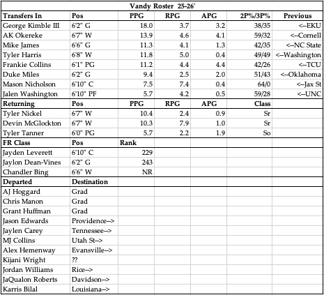 Mark Byington deserves a ton of credit for what he did with Vandy last year, bringing in almost an entirely new roster and taking that team to the tourney. He is forced to do that again basically, as he saw 8 guys hit the portal and in turn brought in 8 new faces via the portal. They do get 2 starters back with Nickel and McGlockton back as the starting frontcourt, but they’ll likely hope that Jalen Washington from UNC can be the starting 5 and actually give them some size inside after starting those 2 at just 6’7″ last year down the stretch at the 4/5 spots. The backcourt is entirely overhauled, and while the metric sites seem to like all that they added, it looks to me like a lot of inefficient scorers, relying on a guy like Frankie Collins who is now on his 4th team in 4 years, to run the show. There are some nice pieces here don’t get me wrong, with guys like James and Miles already proving they can produce at the P5 level. My concern with them is on the defensive side of the ball, and my mind is blown at what sites like KP and Miya have them ranked preseason on that end given how bad they were last year and how bad Byington teams have historically played on that end. I for one, do not expect them to transform into a top-25 defense like KP does, as Byington has never even had a top-70 team defensively. He wants to play fast and score, defense seems to be an after thought. They should rebound better, maybe defend the paint better with Washington, but I still don’t see it being the emphasis that it needs to be to get to that level. Because of that I think they’re a bubble team that will be right on the border of in or NIT, and while he proved his ability to build the roster last year and get them to play well offensively, it cannot be overstated how difficult it is to do that and get a team to be elite defensively. I don’t see that happening, unlike some computers.
