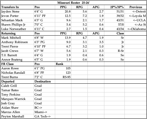 Have to give Dennis Gates his flowers here because heading into last year this program, and his reputation, were in total flux. Year 1 saw them make a surprise tourney run and win a game, and then the wheels fell of and they went 0-18 in the SEC in 2024. Remarkably, the administration stuck with Gates, as did a good portion of the team, and with some transfer help they quickly rebounded to make another tourney appearance last year. Once again, Gates is welcoming back a good portion of last year’s roster, with returning starters Mark Mitchell, Anthony Robinson and Trent Pierce all back. The bigger thing I’ve been watching is he’s retaining both FR and transfers in, so the guys are buying into what he’s selling here even with that disaster results wise in 2024. All of that said, they did lose some very important pieces in the backcourt, as Grill, Bates, Perkins and Warrick were all big time contributors and integral to their success. So, how are they backfilling? Well, they’re going to turn to transfers Jayden Stone and Sebastian Mack plus top-100 recruit Boateng who they’ll need to make a SO jump. Therein-lies the reason for them being this low in my mind, as they were a top-10 offense both years Gates got them to the tourney, and I’m not feeling that great about Mack and Stone, both guys who have struggled from 3. They have never defended well under Gates overall, but their 2 good seasons they were top-10 in steal %. That’s the goal here, playing fast and high pressure D that generates steals by gambling. Don’t succeed and you’re out of position and give up a bucket. In summary, I see regression on both ends. Maybe Stone and Mack deliver, maybe they defend the paint better and generate steals at the same rate, but that’s too much to overcome in my opinion to see them repeat last year’s success.