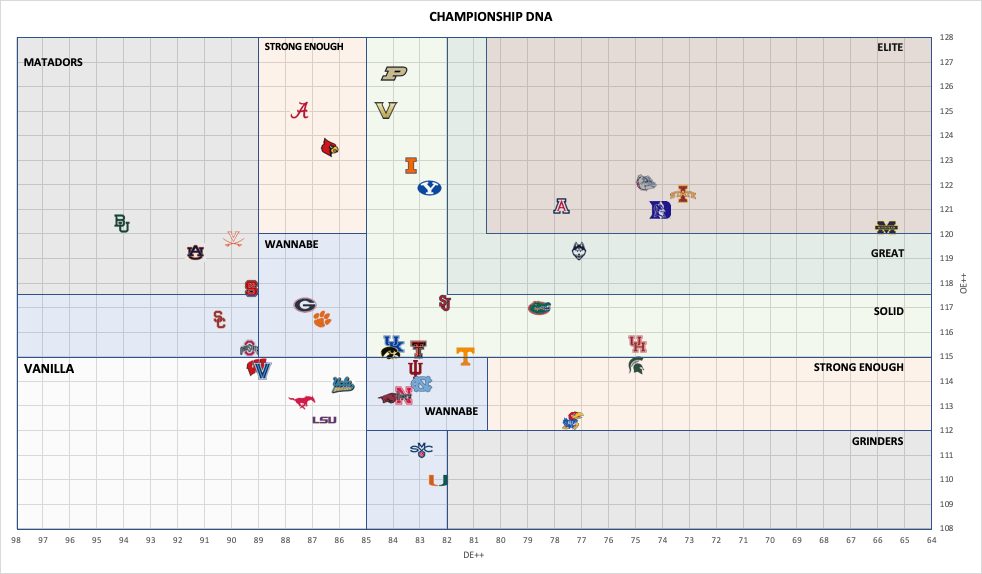 Once the data was compiled it was time to test my original theory and see if I could identify common characteristics that most often led to deep runs in the tournament. My original hypothesis was that despite high overall efficiency, the teams that lean heavily on one end of the floor struggle more than well balanced teams, even if less efficient overall. As I studied and pulled the data my hypothesis was largely proven right, so I began to try and classify certain archetypes of teams. I landed on 8 key archetypes; Elite – Great – Solid – Strong Enough – Matadors – Grinders – Wannabes – Vanilla. Here is the table with exact historical results: Note: R2 indicates teams who reached the 2nd round, all the way to CH which indicates the teams who reached the Titlegame (46 total over 23 years).