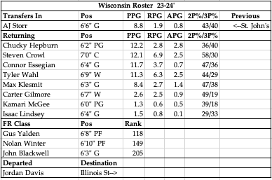 This Wisconsin team doesn’t have the ceiling of a team a la 2022 with Johnny Davis, but this group is as solid as it gets below that elite tier. I love the backcourt of Hepburn, Essigian, Klesmit and Storr as they are all really good shooters and Storr is going to help relieve some of the playmaking duties from Chucky in the half-court. They were a top-20 team defensively last year, that’s not going anywhere, it’s going to come down to scoring the basketball consistently. If they can get more efficient, they can really compete with these top teams in the Big Ten, and maybe be right there battling for a Ship come late February. They are right there with Purdue and Sparty with returning talent, they just have to find a way to close the gap between them that existed a season ago. I don’t see them winning the Conference, but being right there as that 2nd tier in the Big Ten is my expectation. Tyler Wahl is the question mark, as last year was marred with injuries but it was a huge regression year, down from a 107 offensive rating to 93. He went from 57% from 2 to 42%. Much of that could be due to injury, and a return to his previous form could also help elevate this Badger team. So much promise, but there’s till that chance they can’t score and find themselves struggling once again to sniff the tourney. I like them, I’m buying the promise, but with much caution.